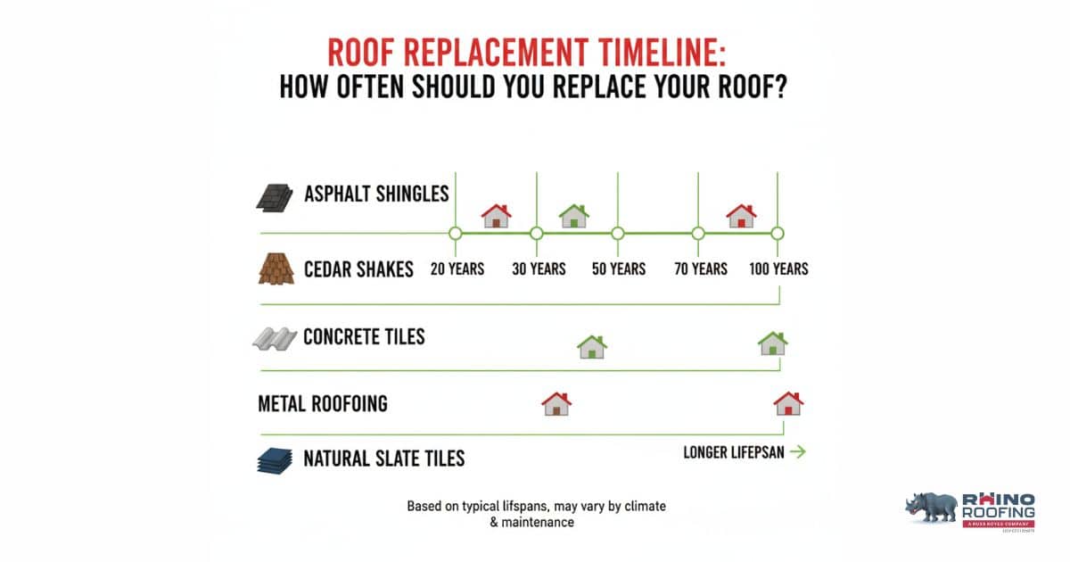 Roof replacement typically occurs every 20-30 years, depending on the material used. Asphalt shingles last 20-25 years, tile roofs can last 50+ years, and flat roofs have the shortest lifespan of 15-30 years. Regular inspections and maintenance are crucial to ensure your roof’s longevity.